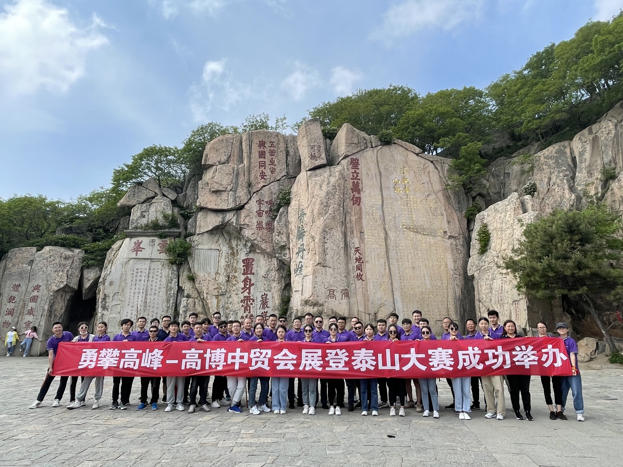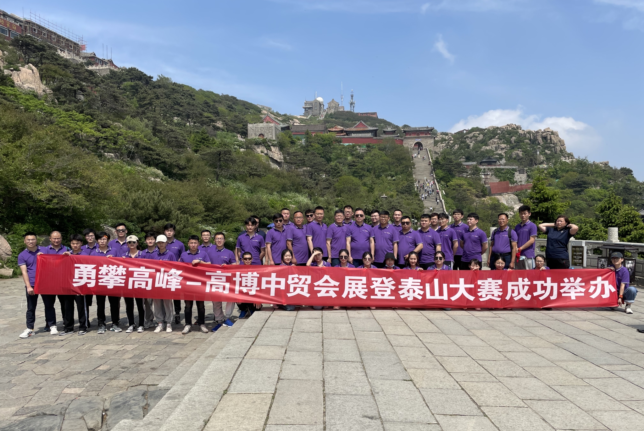 5月31日早,全體員工統(tǒng)一著工裝,乘坐大巴前往泰山,員工們熱情高漲,到達(dá)中天門(mén)后開(kāi)始徒步登山,在中貿(mào)集團(tuán)(高博中貿(mào)國(guó)際會(huì)展集團(tuán))董事長(zhǎng)杜磊的帶領(lǐng)下,向玉皇頂發(fā)起沖鋒。1532.7米的海拔,3000余級(jí)臺(tái)階,中貿(mào)家人們齊心協(xié)力,一路同心,終登泰山之巔。“會(huì)當(dāng)凌絕頂,一覽眾山小”,此次泰山之行也讓中貿(mào)人切實(shí)感受到,堅(jiān)持是最大的力量,只有不斷接受新的挑戰(zhàn),勇于突破,才能看到更美的風(fēng)景。登高望遠(yuǎn),高博中貿(mào)國(guó)際會(huì)展也將再續(xù)新發(fā)展,再啟新征程!