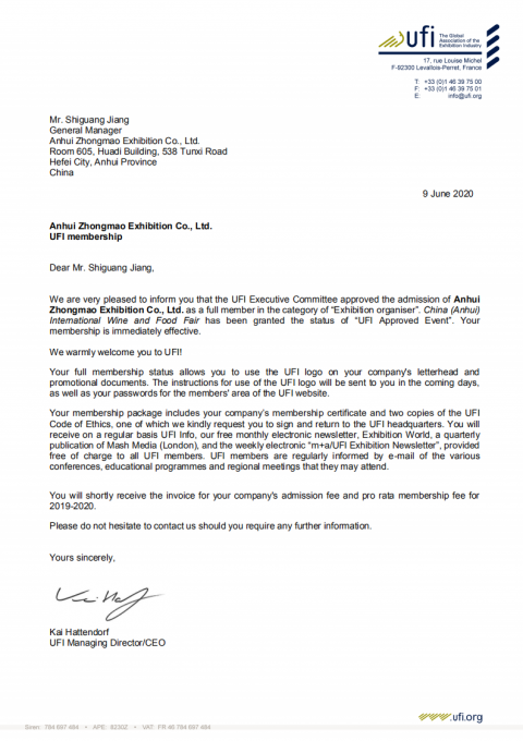 2020年6月9日,UFI(全球展覽業(yè)協(xié)會)巴黎總部傳來喜訊:中法合資高博中貿(mào)會展在山東、江蘇、安徽主辦的CNFE全國食品博覽會(濟(jì)南)、CNWFF中國(南京)···