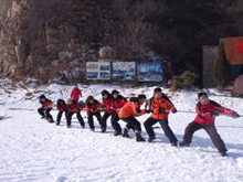 來到滑雪大廳,第一個步驟就是換裝:換上滑雪服和滑雪鞋,感覺自己就像是太空人,一切都是那么的新奇;滑雪裝備準(zhǔn)備齊全之后,我們進入了滑雪場地,剛剛開始感覺舉步維艱,仿佛一不小心就會摔倒在地,但慢慢的我們就會滑上一小步了,我們?yōu)樽约旱男⌒〉倪M步而歡呼雀躍。爾后,我們在杜總和劉總的帶領(lǐng)下爬上了雪坡,在掌握了一些滑雪技巧之后,我們開始陸續(xù)的往下滑,去體驗俯沖的刺激、摔倒的驚險和同事間互相幫助的喜悅,在經(jīng)歷了不計其數(shù)的摔倒、爬起再摔倒的循環(huán)后,每個人都掌握了滑雪的基本技巧,其中,劉總、張存、李萍作為技巧最好的代表,每一次的俯沖都贏得了大家的掌聲和贊嘆?;┚拖袷亲稣褂[,剛開始感覺很陌生,慢慢的掌握了技巧,每個人都會在自己的領(lǐng)域游刃有余,只要你努力、堅持、不斷的探索,相信每一個中貿(mào)人都會在中貿(mào)的大環(huán)境下打拼出屬于自己的一片天地。上午的時間就在滑雪的緊張和喜悅中悄然而逝,中午我們在金象山餐廳中領(lǐng)略了農(nóng)家特色菜肴的美味。稍事的休息之后,我們開始了下午的活動,首先我們進行了拔河比賽,一、二組為一隊由李總領(lǐng)隊,三、四組為一隊由劉總作為領(lǐng)隊,總裁判由杜總擔(dān)任。先是進行了一場熱身賽,我們一隊保存了實力,二隊獲勝。真正的比賽開始了,在先失一局的情況下,李總總結(jié)教訓(xùn),讓三位男士朱峰、張存、張章到最前面,女士在后,一隊一鼓作氣,贏得了2、3局,最終一隊以2:1的比分贏得了比賽,每個人都意猶未盡,沉浸在團隊協(xié)作的氛圍之中。