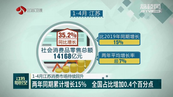 據(jù)相關(guān)統(tǒng)計(jì)數(shù)據(jù)顯示,今年1-4月,江蘇實(shí)現(xiàn)社會(huì)消費(fèi)品零售總額14168億元,同比增長(zhǎng)35.2%,比2019年同期增長(zhǎng)15%,兩年平均增長(zhǎng)率超7%,已達(dá)到往年正常的增長(zhǎng)水平。從全國(guó)層面來(lái)看,1-4月江蘇社會(huì)消費(fèi)品零售總額占全國(guó)的10.2%,較上年提高0.4個(gè)百分點(diǎn),繼續(xù)穩(wěn)居全國(guó)第二。江蘇消費(fèi)市場(chǎng)增幅好于全國(guó)、好于周邊。